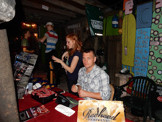 Most of the seating for Blue Heaven is out doors on the patio. They have a ping pong table set up, a local artist selling his paintings in an impromptu gallery, a physic reader, or fortune teller as we used to call them in the old days, a local artisan selling hand made wind chimes, and a gift shop. It's all very eclectic and fun.